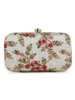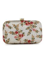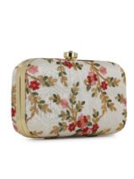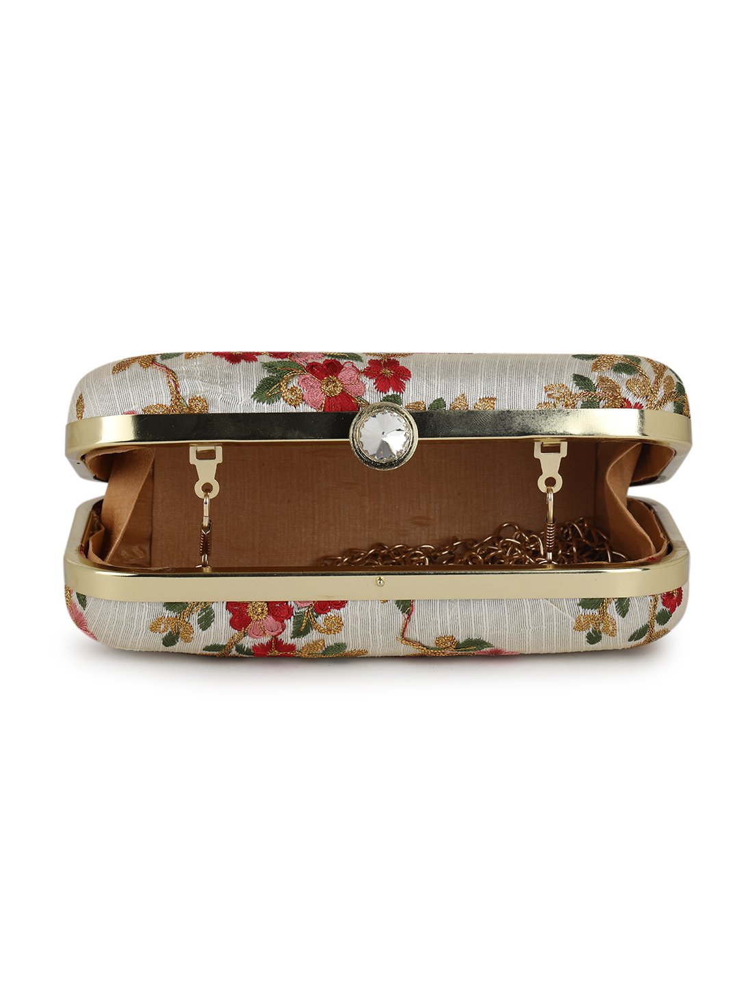 Off White Embroidered Box clutches, Has gold chain shoulder strap, 1 main compartment with twist closure