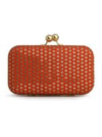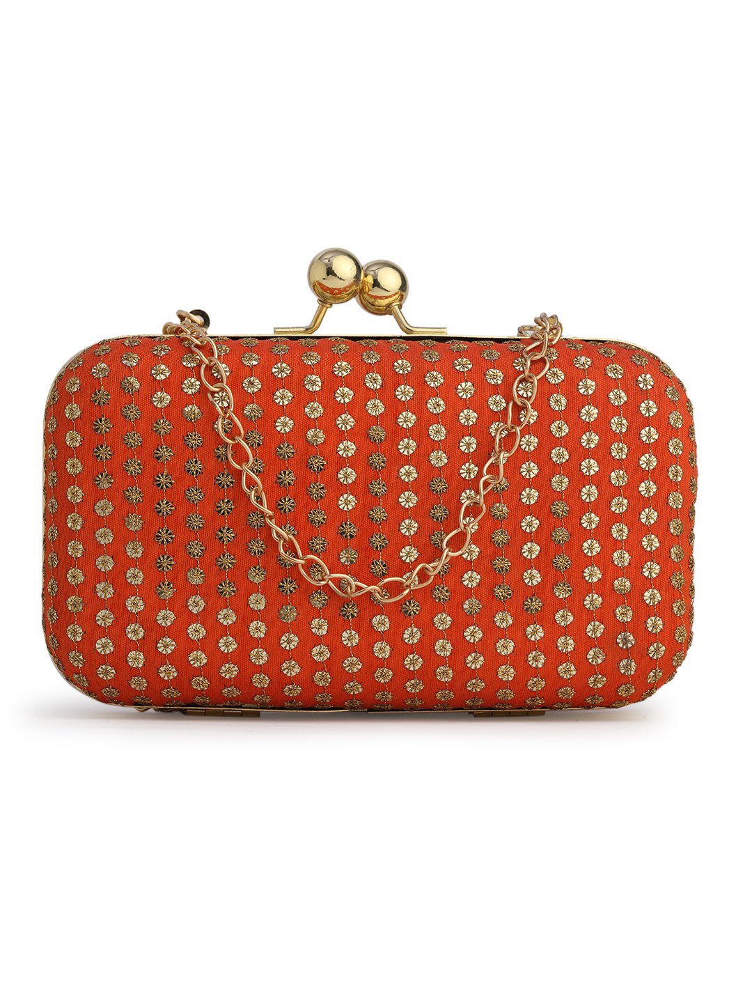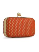 Orange & Gold Embroidered Box clutches, Has gold chain shoulder strap, 1 main compartment with Kiss closure