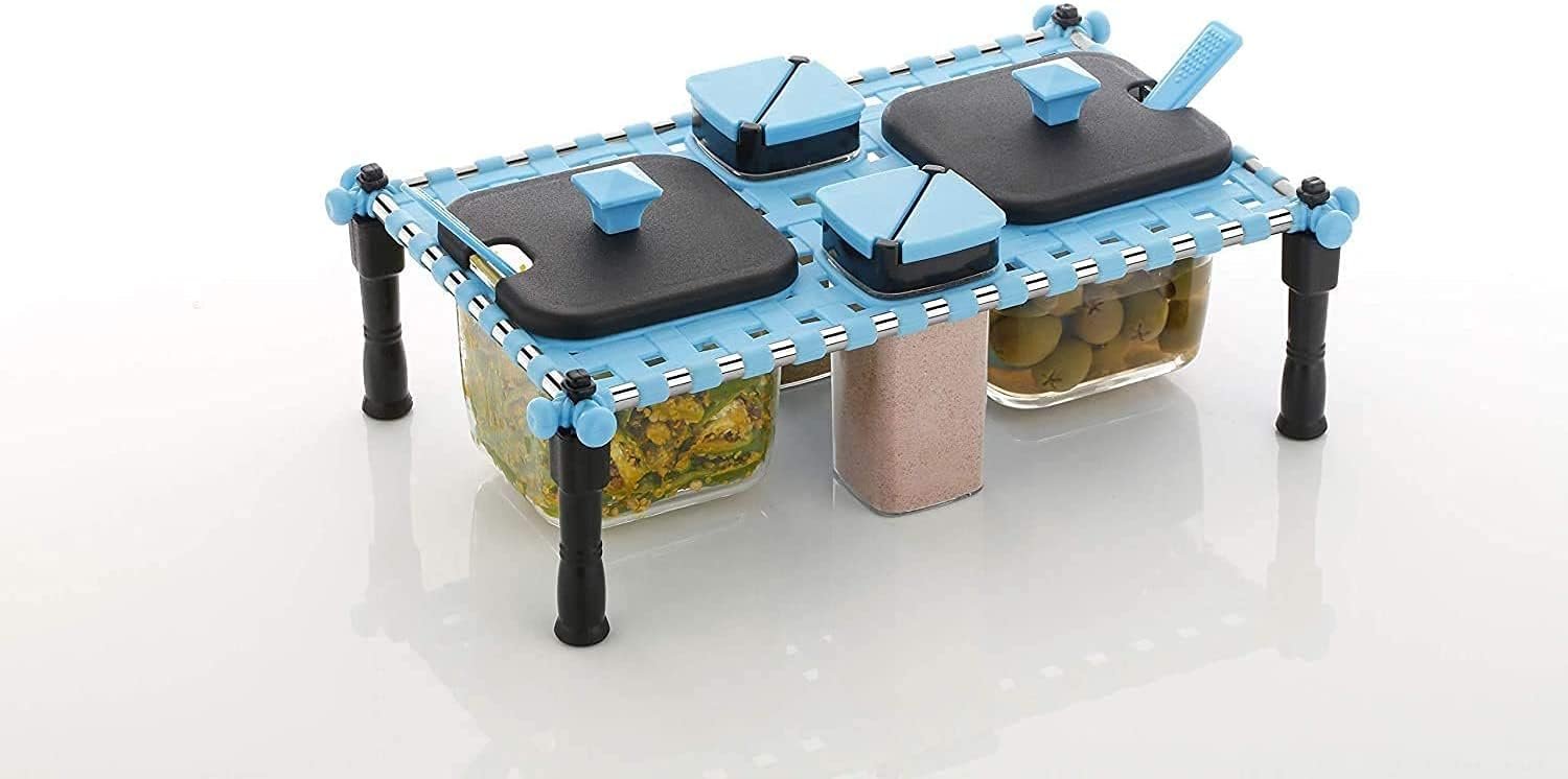 2 In 1 Khatli Style 4 Bottles Multipurpose Revolving Spice Rack Jars & Containers, Khatli Set Spice Jars For Kitchen. Revolving Spice Rack set contains refillable jars which are easy to clean, as they have been made compatible with dishwasher use. *It has 4 spice jars with twistable black lids, which make them easy to open and use. *The containers are transparent with a colored cap. *This ensures that you will easily know when your supplies need to be restocked. *The spice rack is designed with maximum storage capacity occupying minimal space with a very stylish looks. *It is easy to clean and easy to maintain and, therefore, your perfect choice to organize your spice cabinet Storage Containers remains scratch-free and doesn’t get cloudy. *So you can put it in the dishwasher without a worry