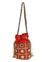 Red and gold-toned embellished potli clutches Has wrist loop 1 main compartment with drawstring closure Size & Fit Height: 18 m Width: 2 cm Depth: 10 cm Material & Care Fabric Wipe with clean, dry cloth